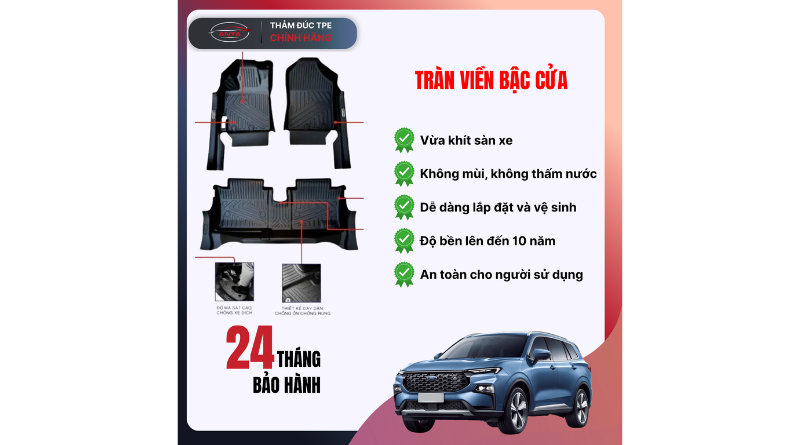 – Giá thành đặc biệt cạnh tranh trên thị trường các hãng bán thảm sàn ô tô hiện nay về dòng thảm lót sàn ô tô TPE.